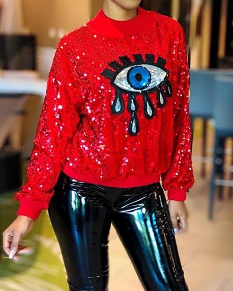 - Eye Sequin Sweatshirt – A statement as soon as you walk into a room. A fun touch and a definite statement for any eye loving momma.